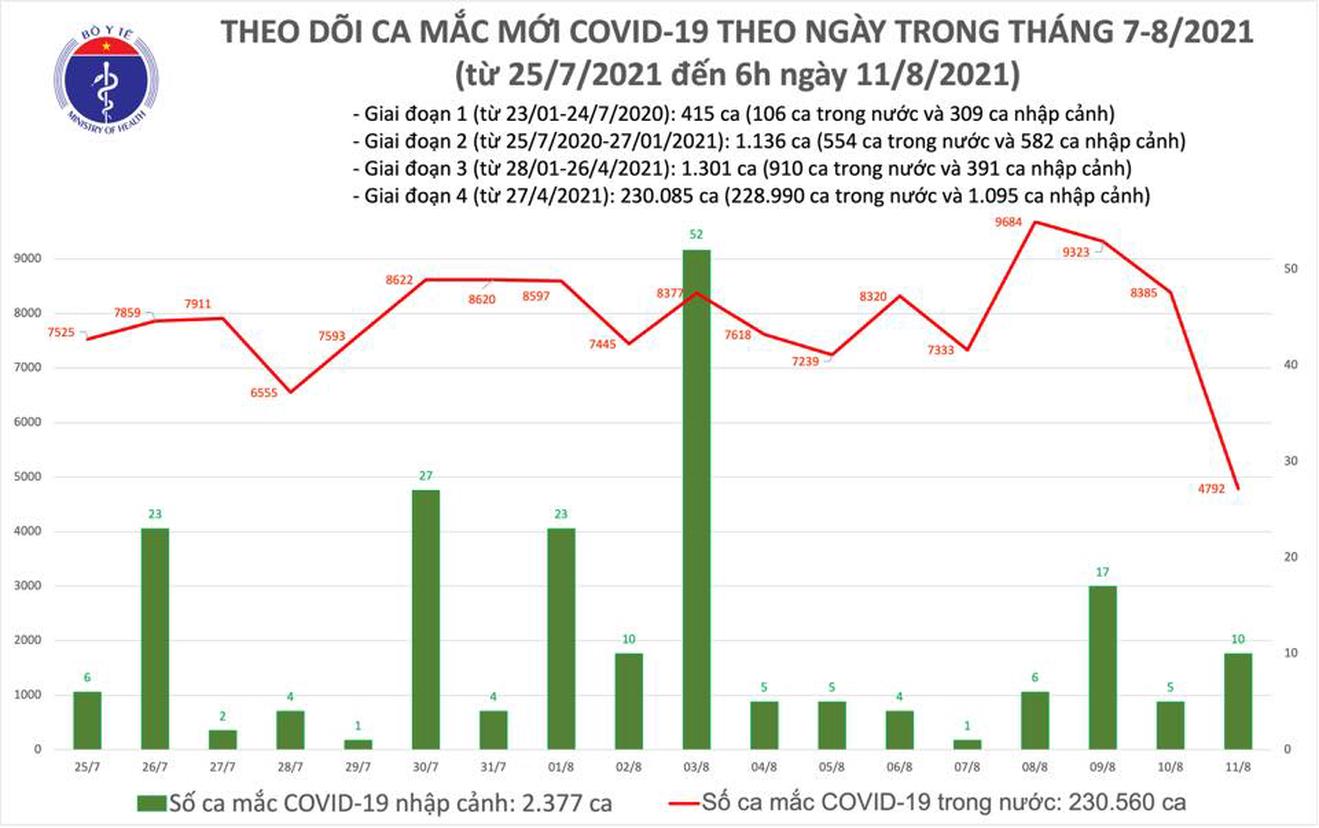 (Thanh tra)- Bộ Y tế sáng 11/8 cho biết vừa ghi nhận thêm 4.802 ca mắc COVID-19, TP. Hồ Chí Minh nhiều nhất với 2.128 ca. Đến nay, cả nước có hơn 11,3 triệu liều vắc xin đã được tiêm.