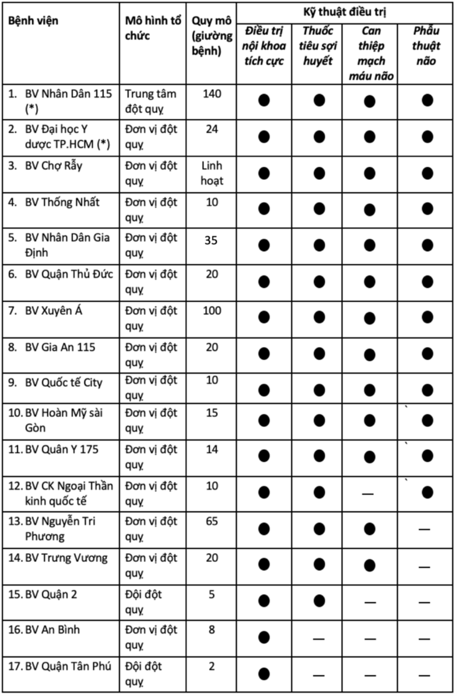 Theo số liệu của Sở Y tế TP HCM, trên địa bàn có tổng cộng 17 BV có thể tiếp nhận và can thiệp điều trị cho bệnh nhân đột quỵ.