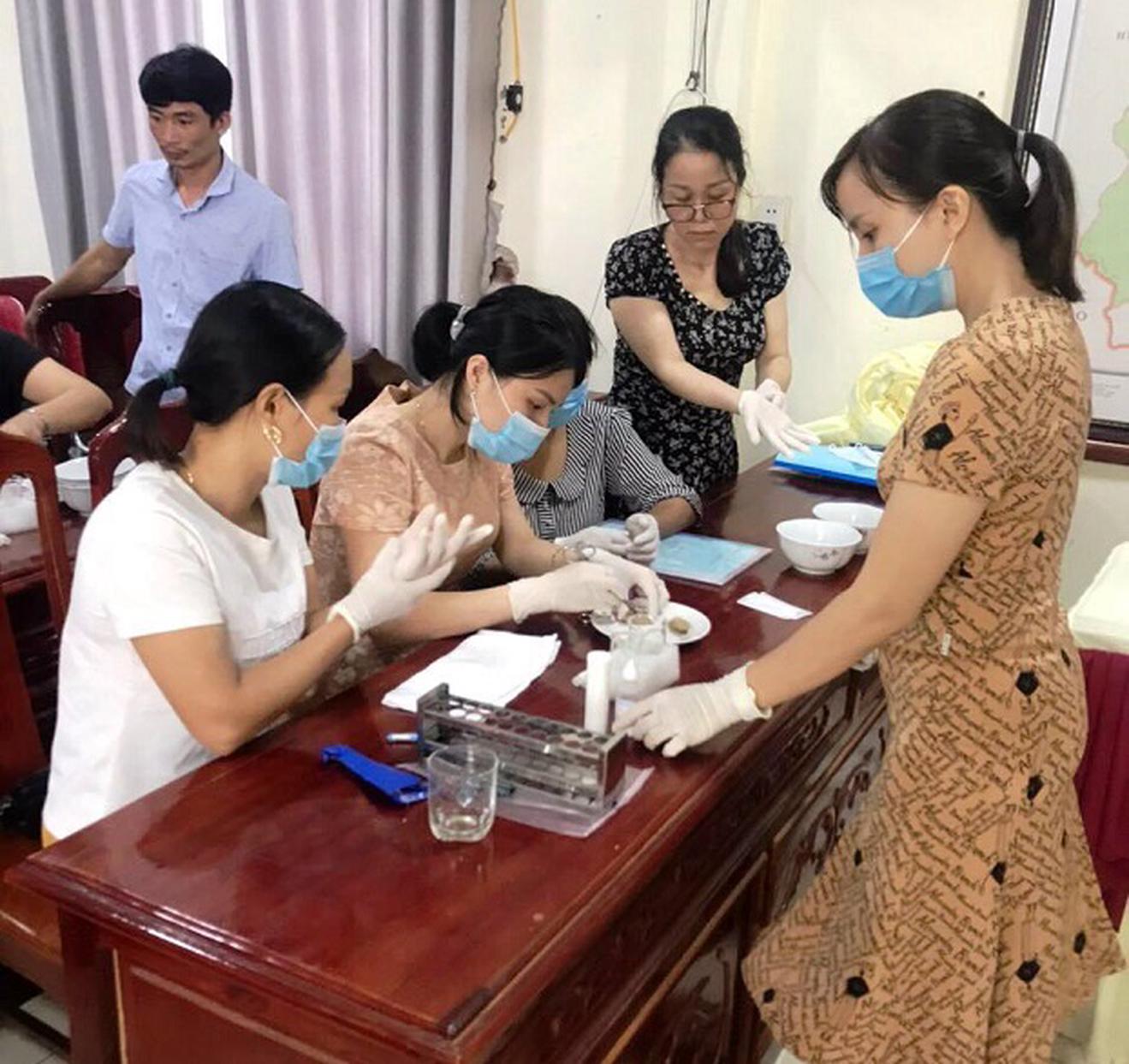 Cán bộ Chi cục An toàn vệ sinh thực phẩm Nghệ An hướng dẫn sử dụng một số loại test nhanh cho các chuyên trách an toàn thực phẩm cấp xã, phường, thị trấn tại huyện Anh Sơn. Ảnh: P.V