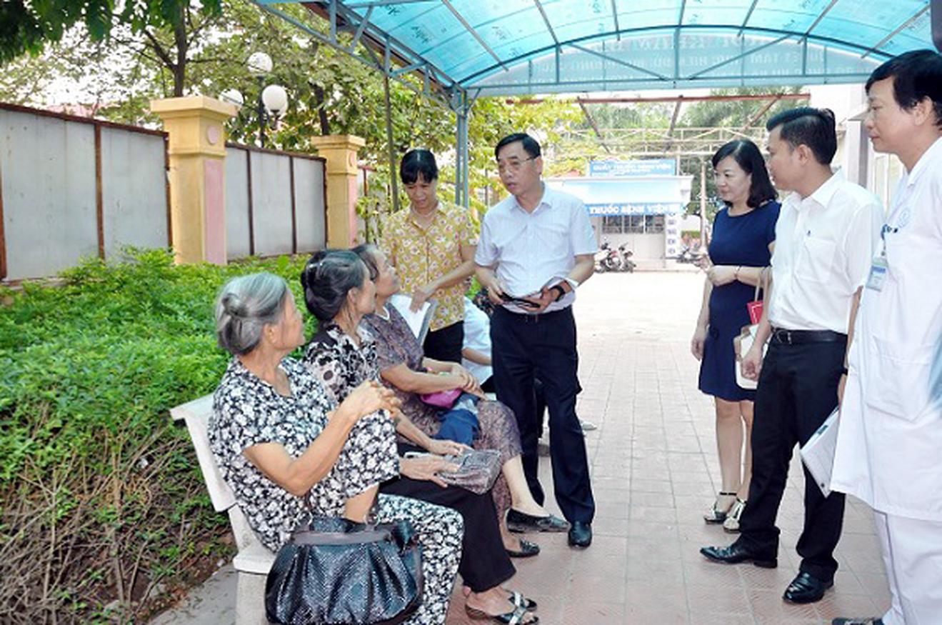 TS Nguyễn Khắc Hiền - Giám đốc Sở Y tế Hà Nội thăm hỏi bệnh nhân đến khám bệnh tại bệnh viện. Ảnh: HH