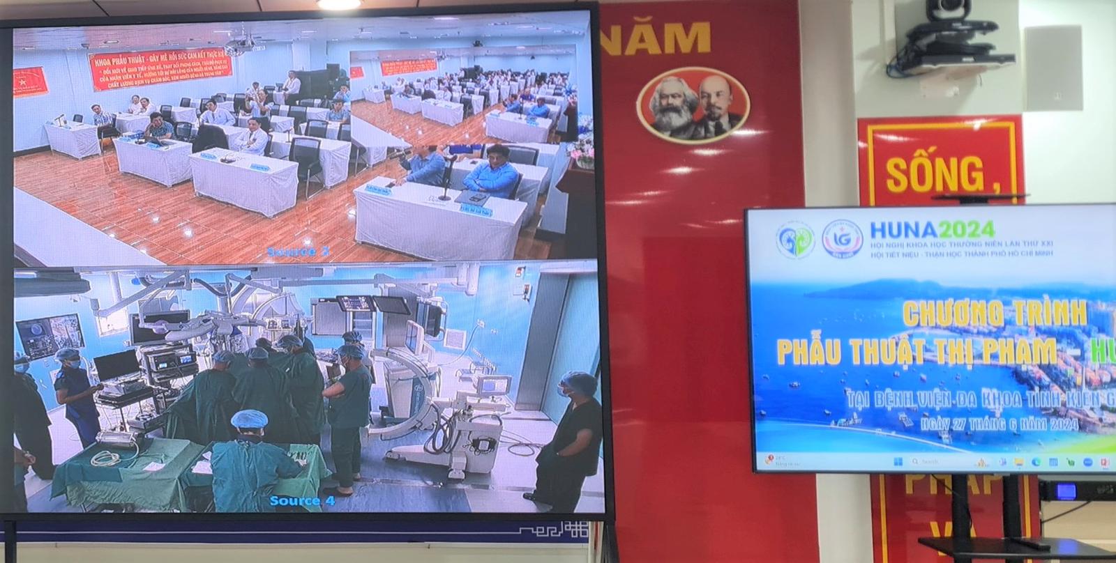Theo đó, có 9 bệnh nhân gặp các vấn đề về thận, tiết niệu được các bác sỹ, chuyên gia hàng đầu về thận, tiết niệu phẫu thuật tại 2 phòng mổ của Bệnh viện Đa khoa tỉnh Kiên Giang và được truyền tín hiệu trực tiếp đến hội trường.