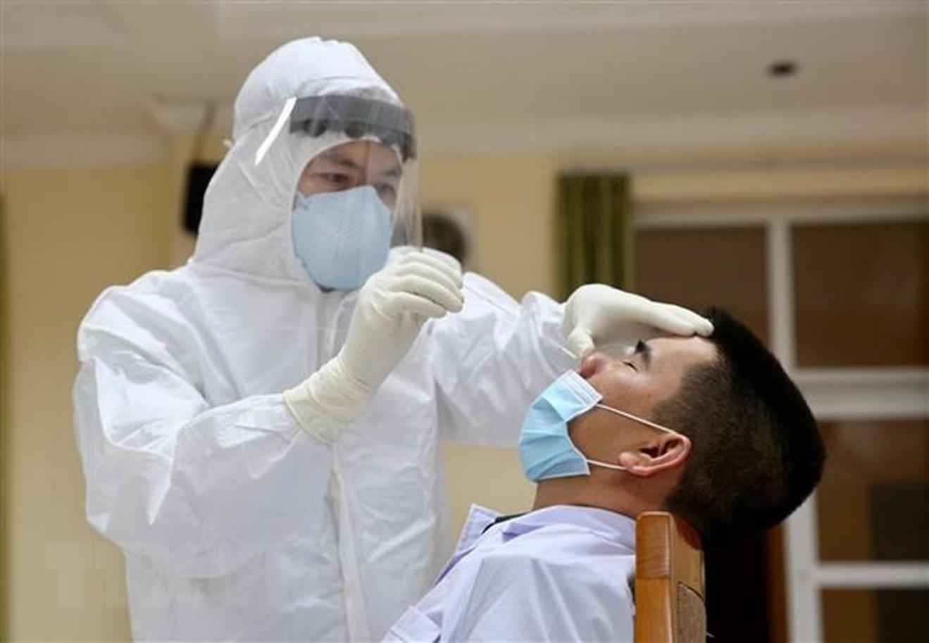 Nhân viên y tế tiến hành lấy mẫu bệnh phẩm từ mũi của người nghi nhiễm để xét nghiệm SARS-CoV-2. (Ảnh: Dương Giang/TTXVN)