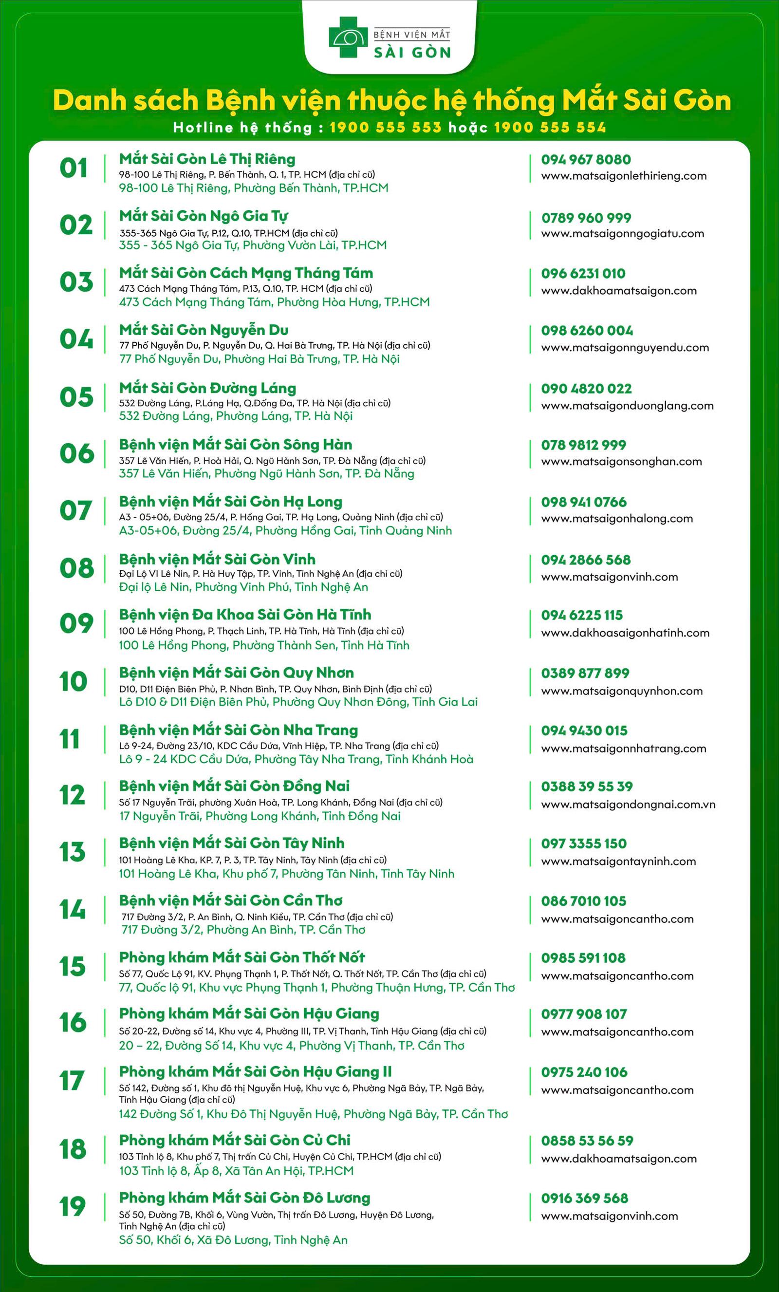 Trước sự mở rộng liên tục về quy mô và mạng lưới, Hệ thống Mắt Sài Gòn khuyến nghị người dân chủ động tra cứu danh sách 19 cơ sở chính thức từ Bắc vào Nam thông qua các kênh thông tin chính thống. Danh sách đầy đủ được công bố công khai trên website www.matsaigon.com, các nền tảng truyền thông chính thức hoặc tổng đài toàn quốc 1900 555553 / 1900 555554 nhằm giúp người dân dễ dàng xác minh trước khi thăm khám.