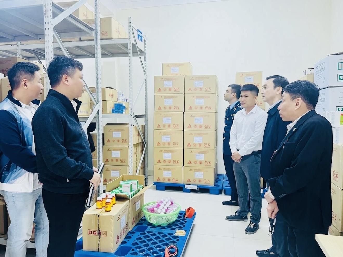 Đoàn kiểm tra tiến hành kiểm tra, đánh giá việc thực hiện các quy định pháp luật về dược, mỹ phẩm tại Chi nhánh Công ty CP Dược Hà Tĩnh, phường Quảng Phú, tỉnh Thanh Hoá. Ảnh: Hương Trà