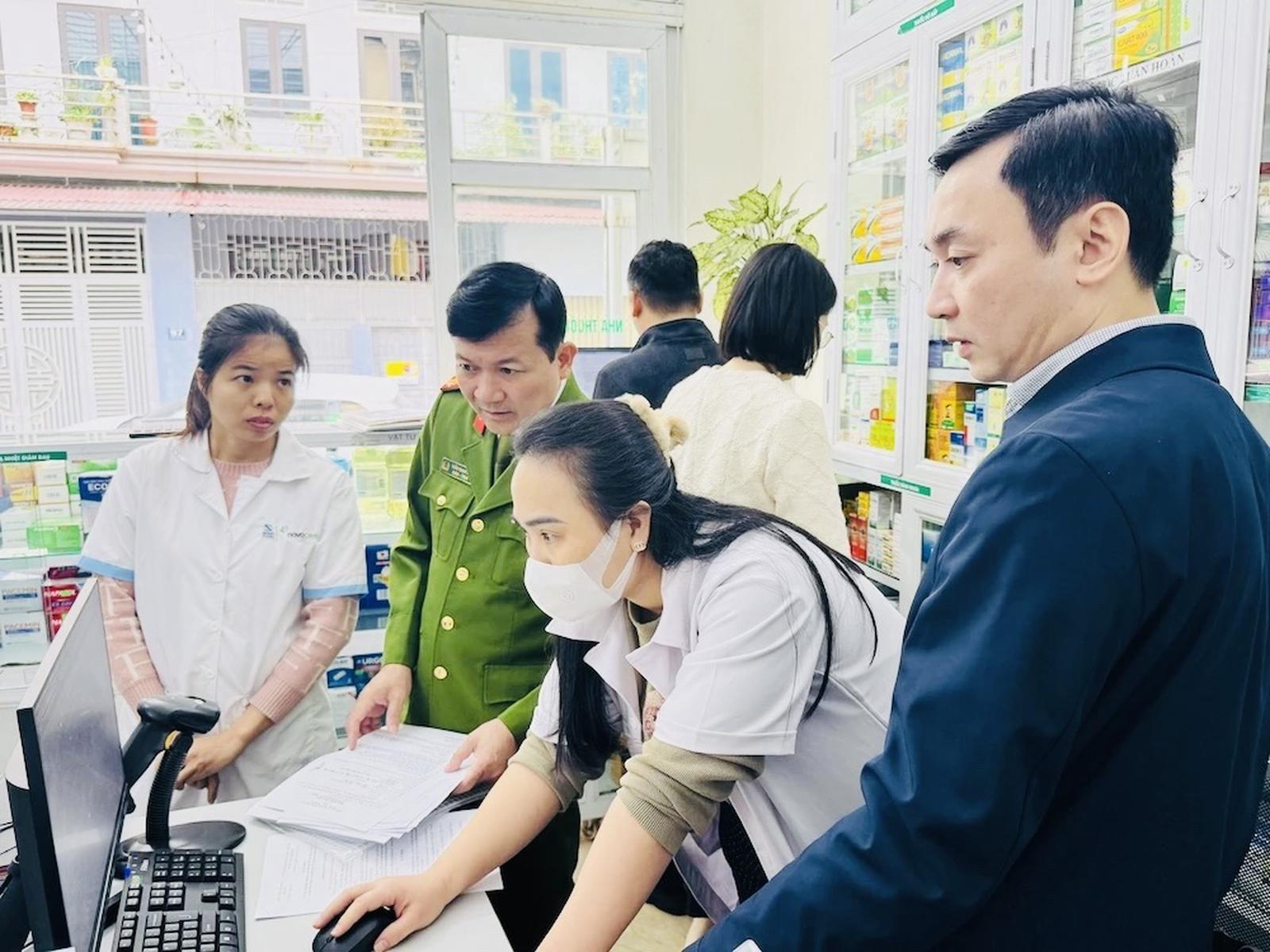 Đoàn kiểm tra tiến hành kiểm tra, đánh giá việc thực hiện các quy định pháp luật về dược, mỹ phẩm tại Nhà thuốc Cường Nhung, phường Hàm Rồng, tỉnh Thanh Hoá. Ảnh: Hương Trà