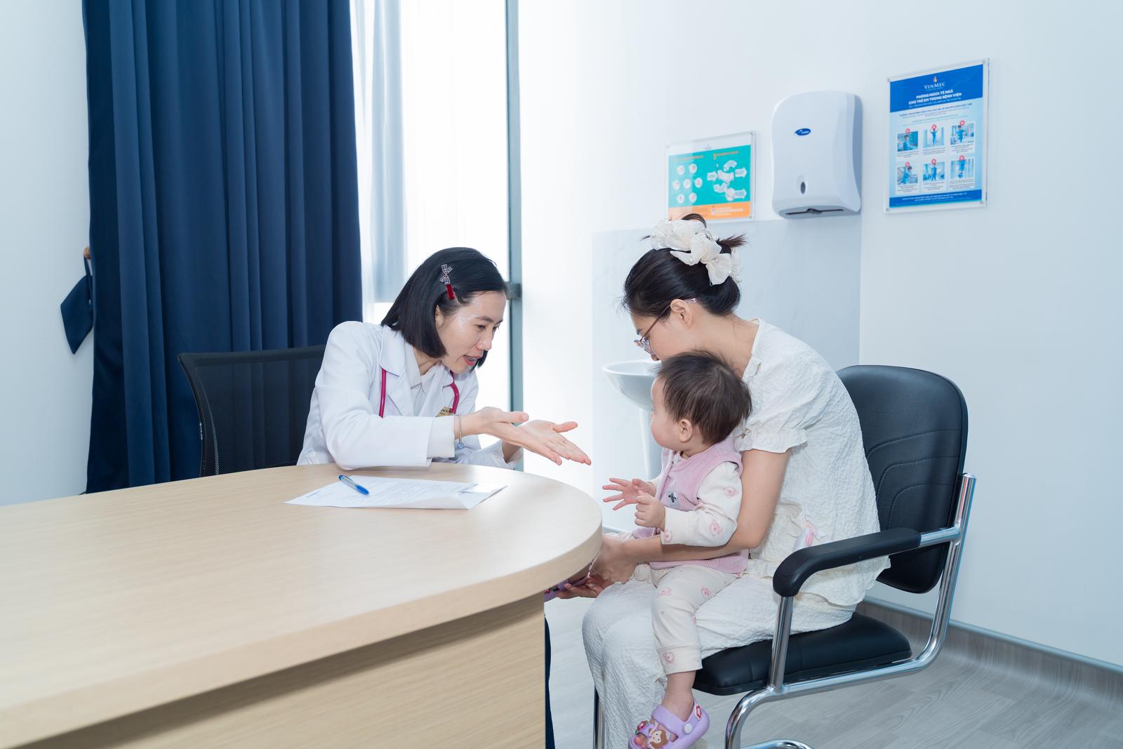 Tại khoa Nhi - Sơ sinh, một bé gái 2 tuổi được ThS.BS Hoàng Thị Mai thăm khám, đánh giá nguy cơ tay chân miệng. Việc thăm khám cho bệnh nhi nhỏ tuổi vốn gặp nhiều khó khăn do trẻ dễ sợ hãi, không hợp tác. Tuy nhiên, với kinh nghiệm chuyên môn cùng sự nhẹ nhàng, tâm lý của đội ngũ bác sĩ, điều dưỡng, bé nhanh chóng ổn định và phối hợp tốt.