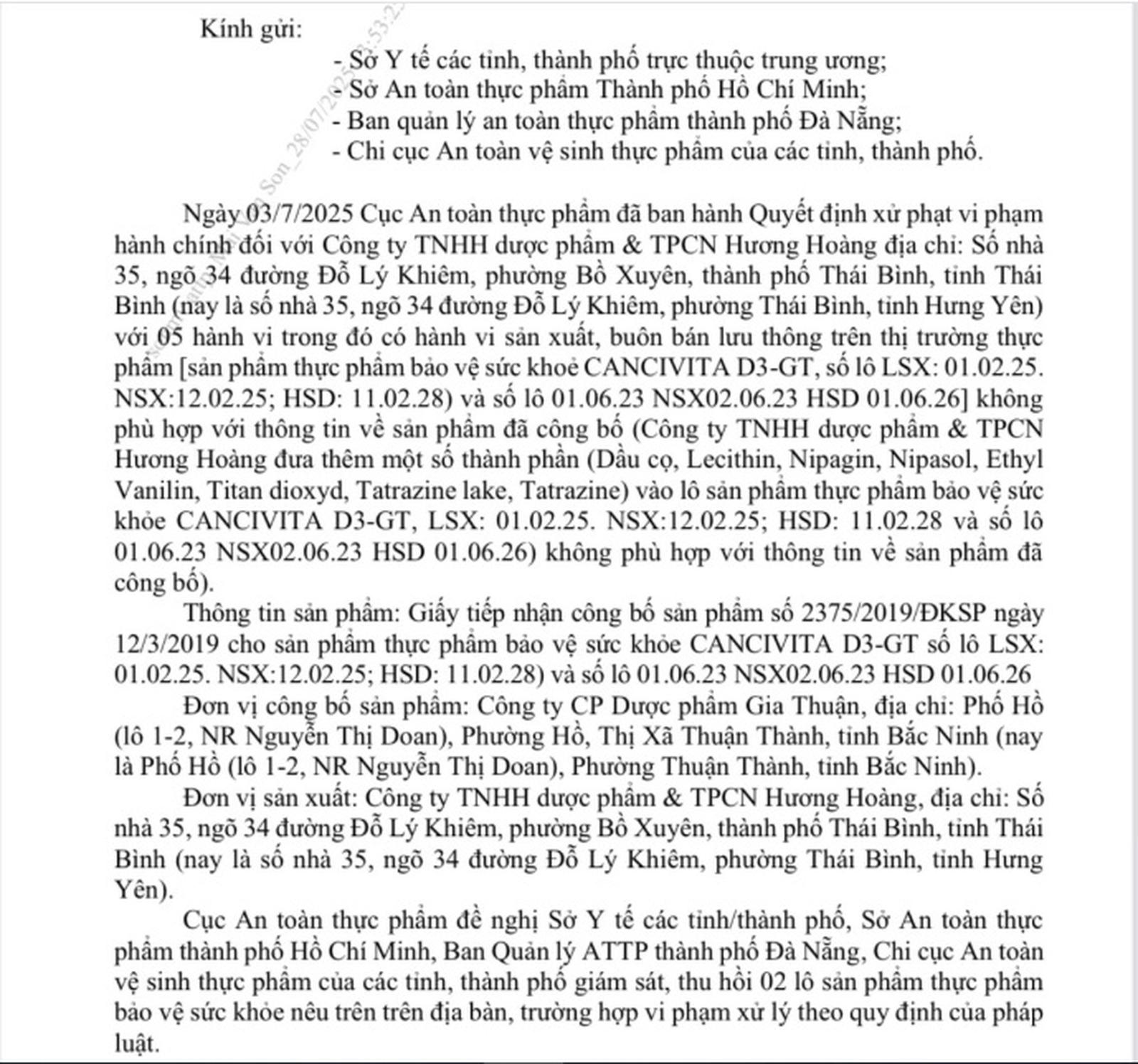 Theo Cục An toàn thực phẩm, Công ty TNHH Dược phẩm và Thực phẩm chức năng Hương Hoàng đã đưa thêm một số thành phần (dầu cọ, lecithin, nipagin, nipasol, ethyl vanilin, titan dioxyd, tatrazine lake, tatrazine) với 2 lô sản phẩm thực phẩm bảo vệ sức khỏe Cancivita D3-GT nêu trên, không phù hợp với thông tin về sản phẩm đã công bố.