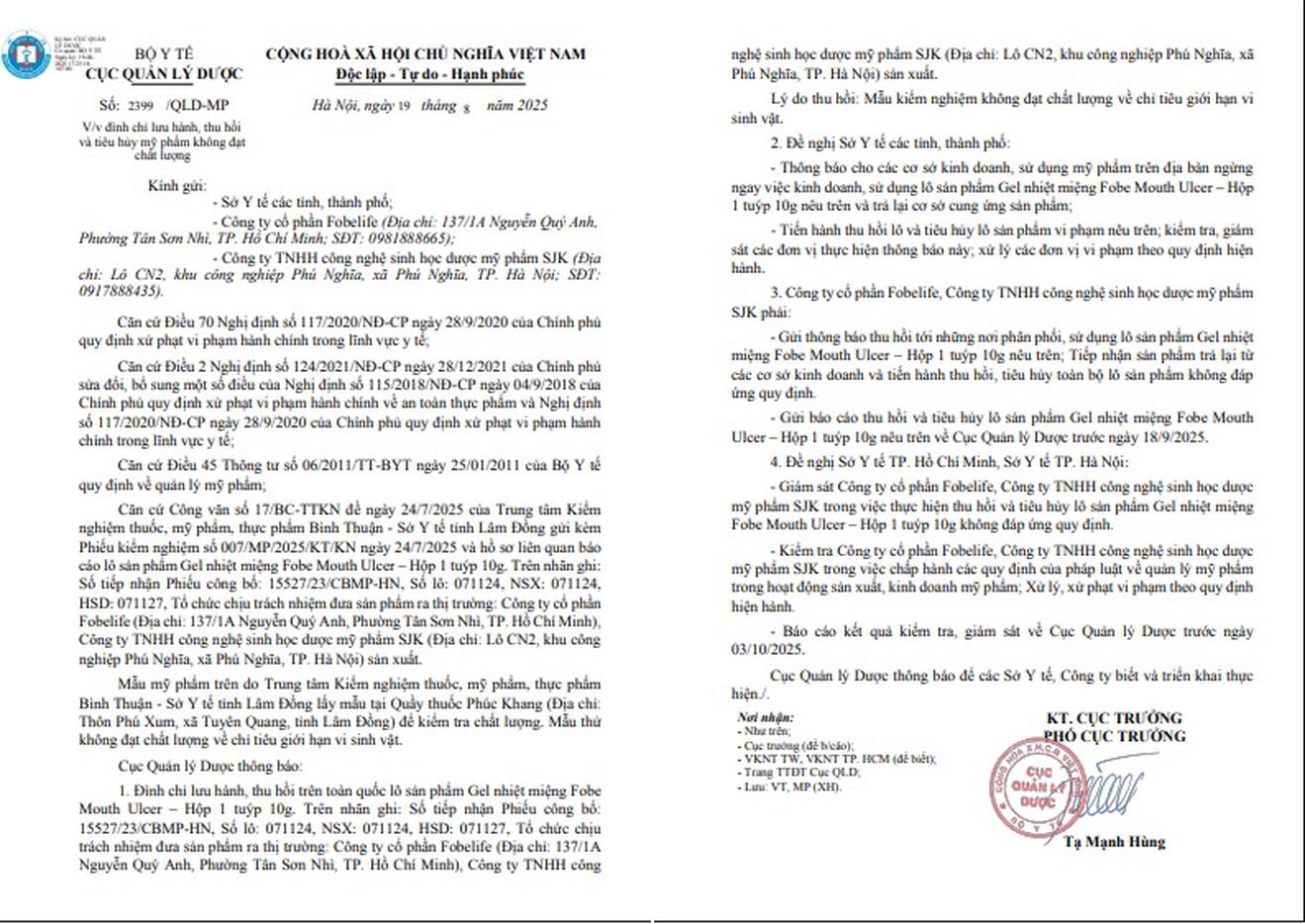 Đồng thời, gửi báo cáo thu hồi và tiêu hủy lô sản phẩm Gel nhiệt miệng Fobe Mouth Ulcer – hộp 1 tuýp 10g về Cục Quản lý Dược trước ngày 18/9/2025.
