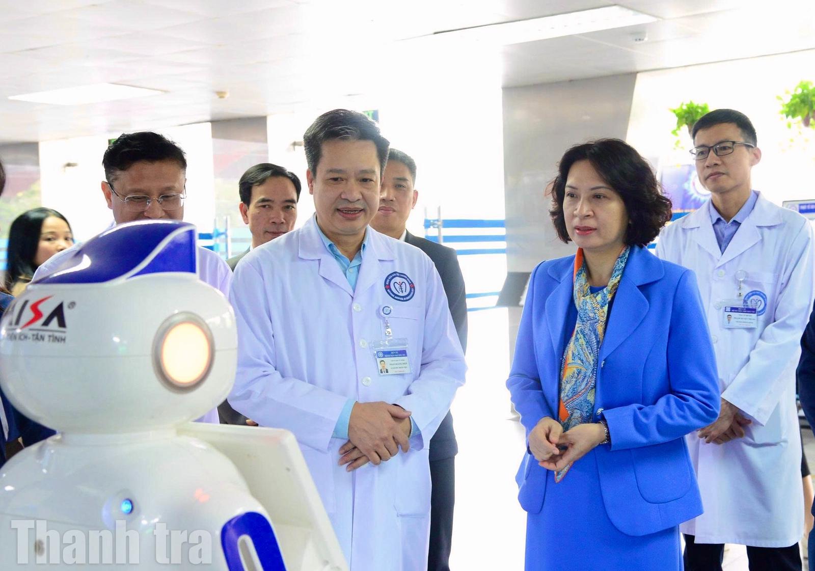 Thứ trưởng Bộ Y tế Nguyễn Thị Liên Hương tham quan robot tiếp đón, hướng dẫn người bệnh tại sảnh chính của bệnh viện. Ảnh: T.L