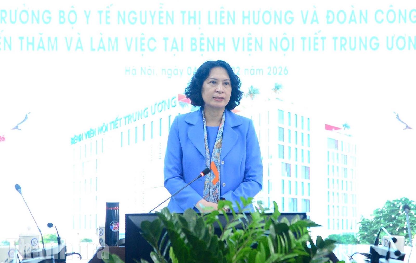 Phát biểu tại buổi làm việc, Thứ trưởng Bộ Y tế Nguyễn Thị Liên Hương ghi nhận, biểu dương và đánh giá cao những kết quả mà Bệnh viện Nội tiết Trung ương đã đạt được trong năm 2025, đặc biệt trong công tác khám chữa bệnh, đào tạo, nghiên cứu khoa học và chuyển đổi số y tế.