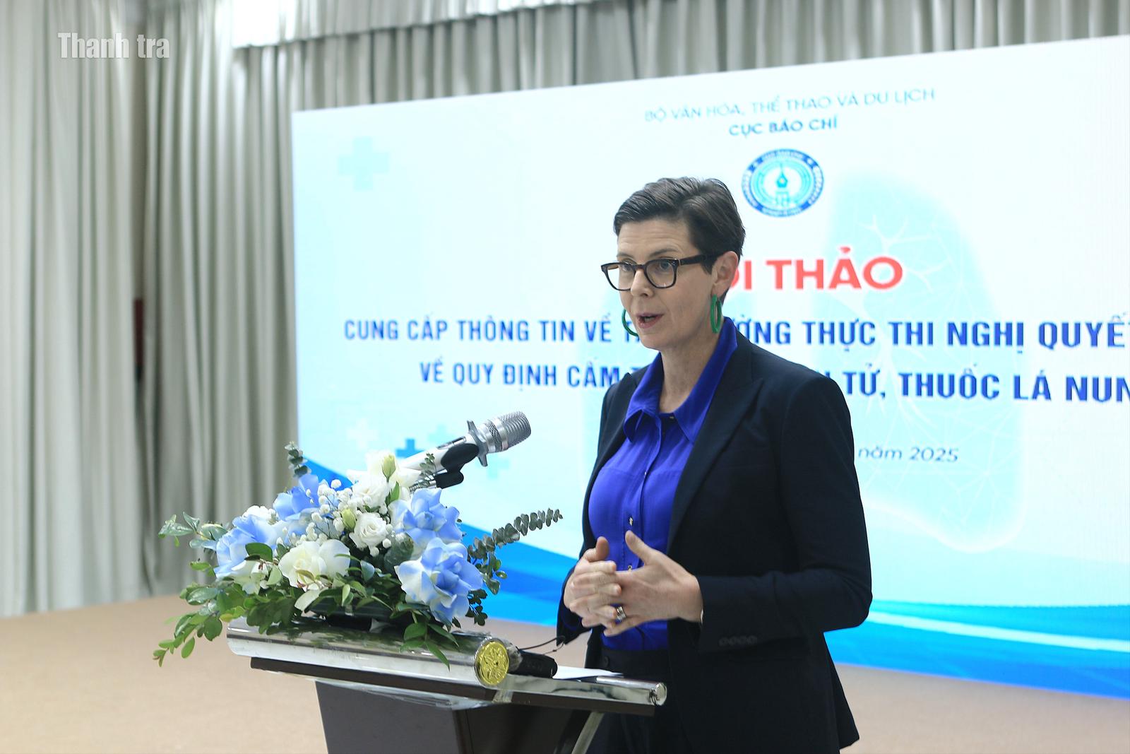 "Quốc hội cần đảm bảo việc thực thi Nghị quyết 173 bằng cách phản ánh đầy đủ lệnh cấm đối với thuốc lá điện tử, thuốc lá nung nóng vào các văn bản quy phạm pháp luật; việc kinh doanh các sản phẩm thuốc lá điện tử, thuốc lá nung nóng cần được vào danh mục các ngành nghề bị cấm và không nên có bất kỳ trường hợp ngoại lệ nào", bà Angela Pratt khuyến nghị.