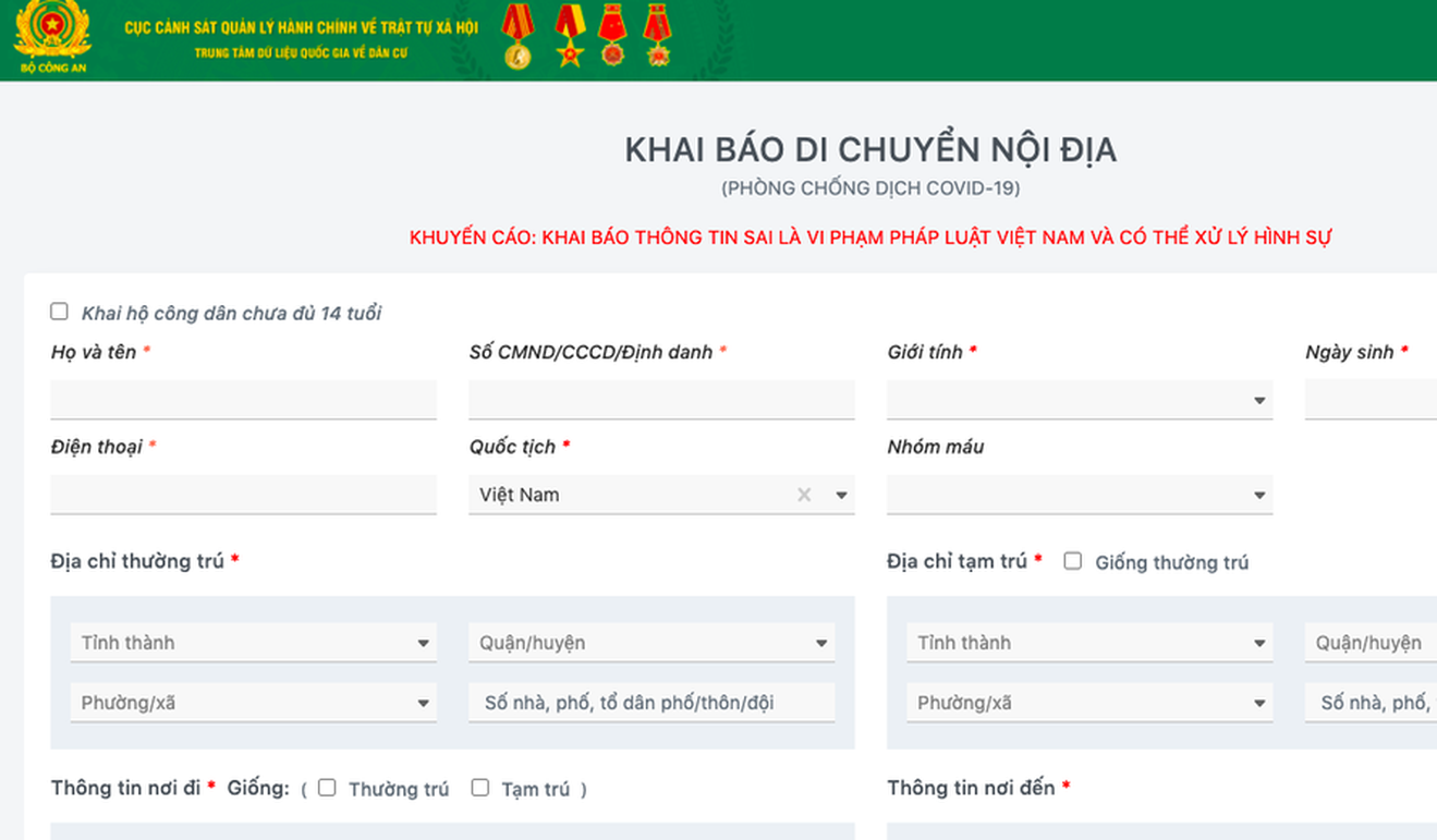 Giao diện chính của hệ thống khai báo do C06 Bộ Công an triển khai xây dựng. Ảnh: QĐ