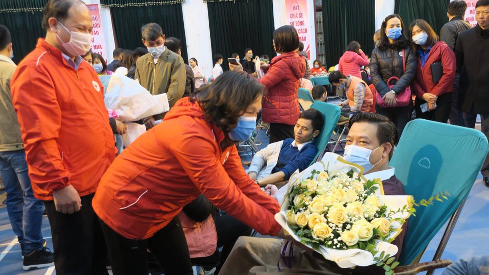 Ban Vận động máu tình nguyện tặng hoa ông Phạm Văn Thép, Giám đốc Sở. Ảnh: HN