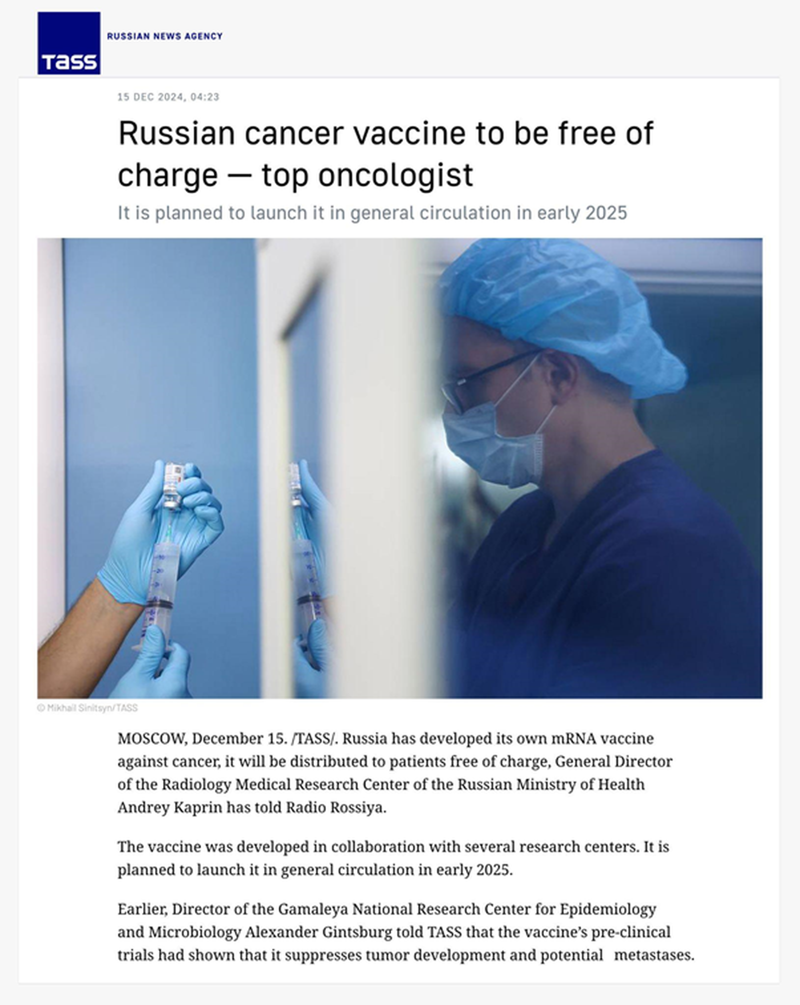Tháng 12/2024, Trung tâm Nghiên cứu Y học Quốc gia về X-quang thuộc Bộ Y tế Nga, thông báo Nga đang nghiên cứu và phát triển vắc xin điều trị ung thư sử dụng công nghệ mRNA hiện đại. Ảnh: TASS
