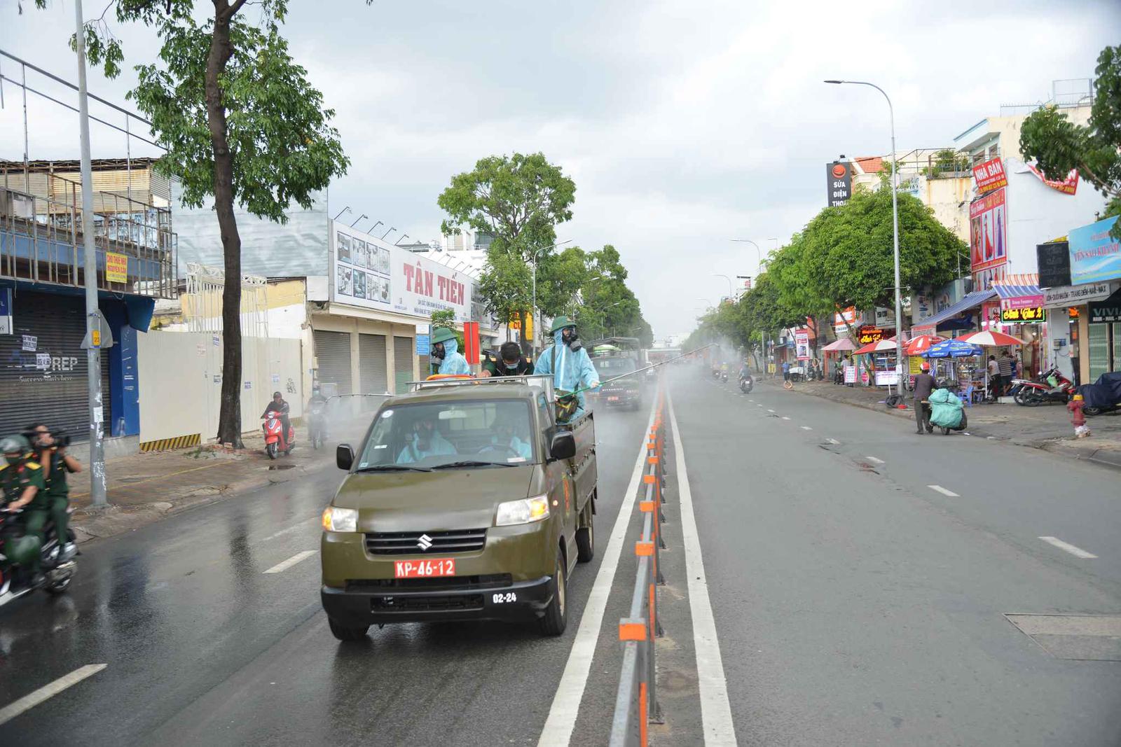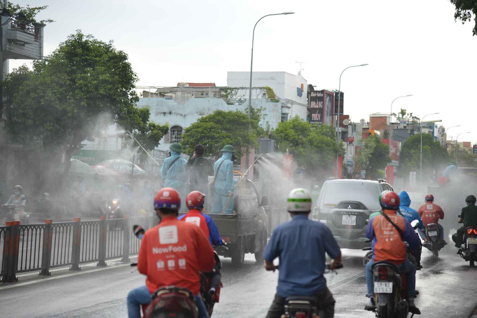 Tại khu vực cầu vượt Nguyễn Thái Sơn, khoảng 5 xe chuyên dụng tiến hành phun tiêu độc khử khuẩn trên trục đường Quang Trung và các tuyến đường như Thống Nhất, Nguyễn Văn Khối và Nguyễn Văn Công vực phường 15, phường 3 cùng nhiều tuyến hẻm.