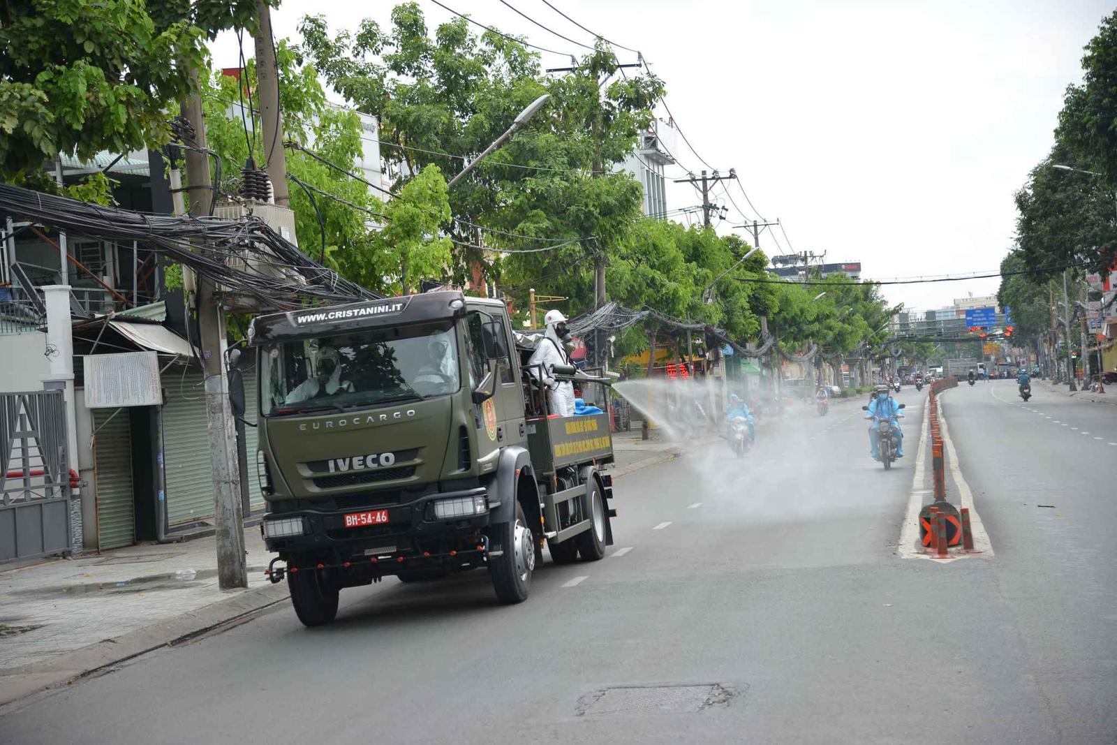 Xe đặc chủng bắt đầu phun khử khuẩn trên tuyến đường Quang Trung, quận Gò Vấp. Ảnh: CTV