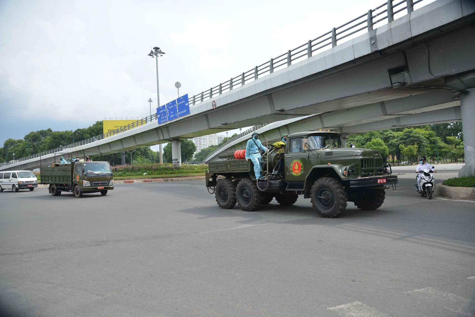 Theo ghi nhận, lực lượng Binh chủng Hóa học tập trung triển khai từ công viên Gia Định với khoảng 10 phương tiện đặc chủng. Ảnh: CTV