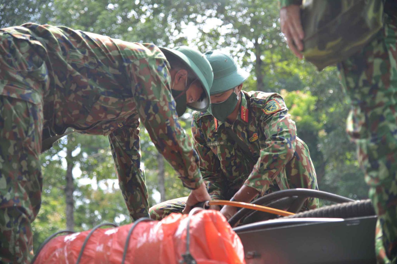 Các cán bộ, chiến sĩ tham gia công tác được mặc đồ bảo hộ và đeo mặt nạ chuyên dụng. Ảnh: CTV