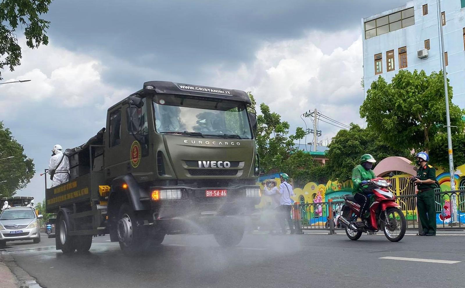 Theo Đại tá Từ Minh Sơn, Tã huy động 70 người với 15 phương tiện đặc chủng cùng 2.000 kg chất Cloramin B để xịt khuẩn. Ảnh: CTV