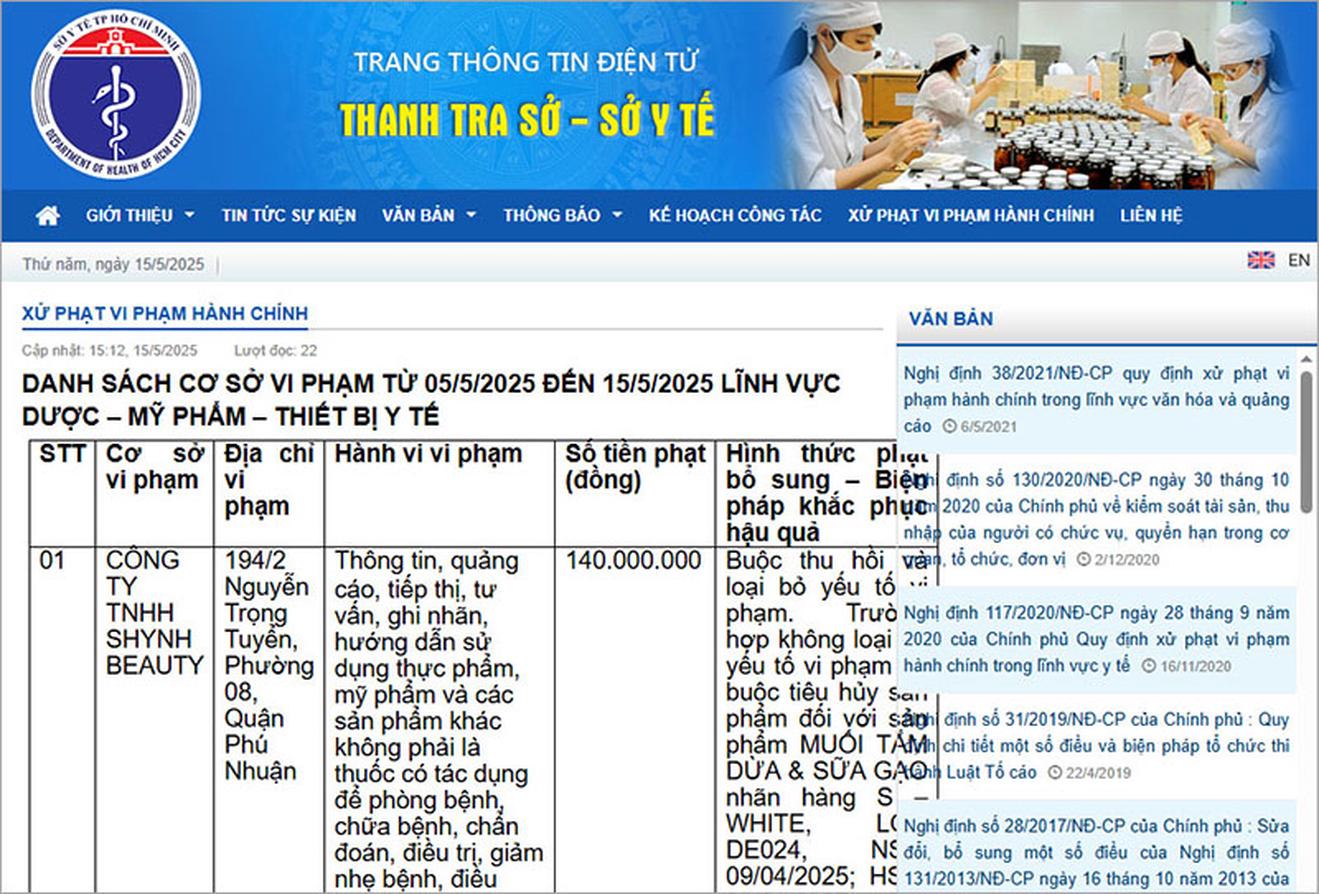 Ngày 15/5, Thanh tra Sở Y tế TP Hồ Chí Minh thông tin về việc xử lý vi phạm đối với Công ty TNHH Shynh Beauty (Phường 8, quận Phú Nhuận, TP Hồ Chí Minh).