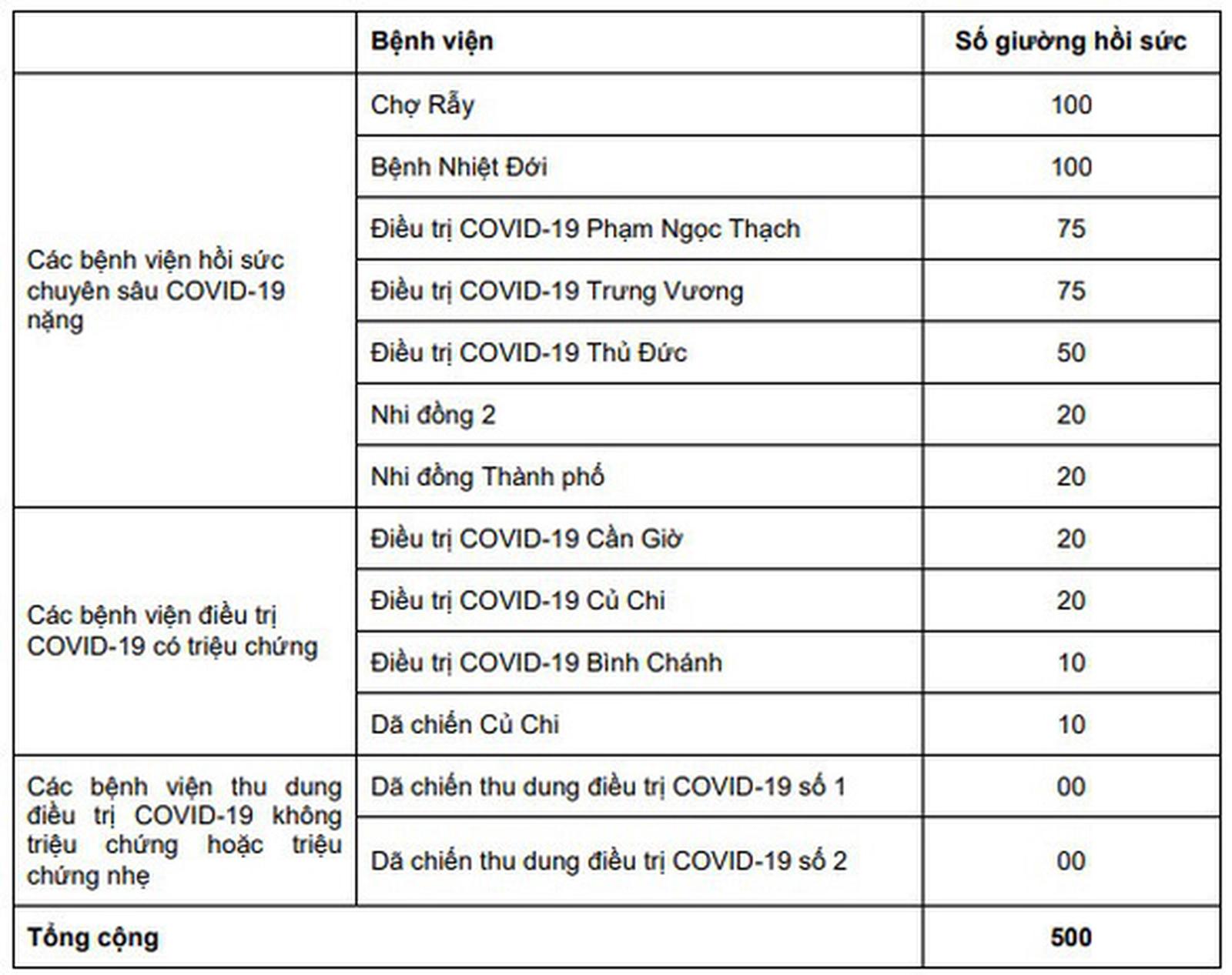 Danh sách các bệnh viện được Sở Y tế phân công điều trị cho 500 trường hợp Covid-19 nặng. Ảnh: Sở Y tế