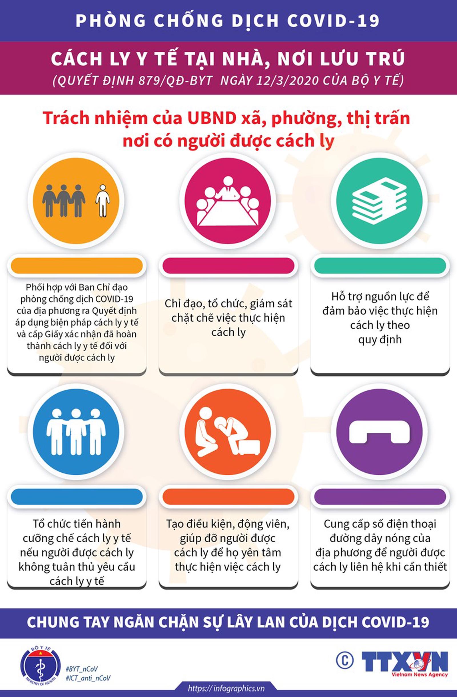 Ủy ban Nhân dân xã, phường, thị trấn nơi có người được cách ly cần phối hợp với Ban Chỉ đạo phòng chống dịch COVID-19 của địa phương ra Quyết định áp dụng biện pháp cách ly y tế và cấp Giấy xác nhận đã hoàn thành cách ly y tế đối với người được cách ly; chỉ đạo, tổ chức, giám sát chặt chẽ việc thực hiện cách ly...