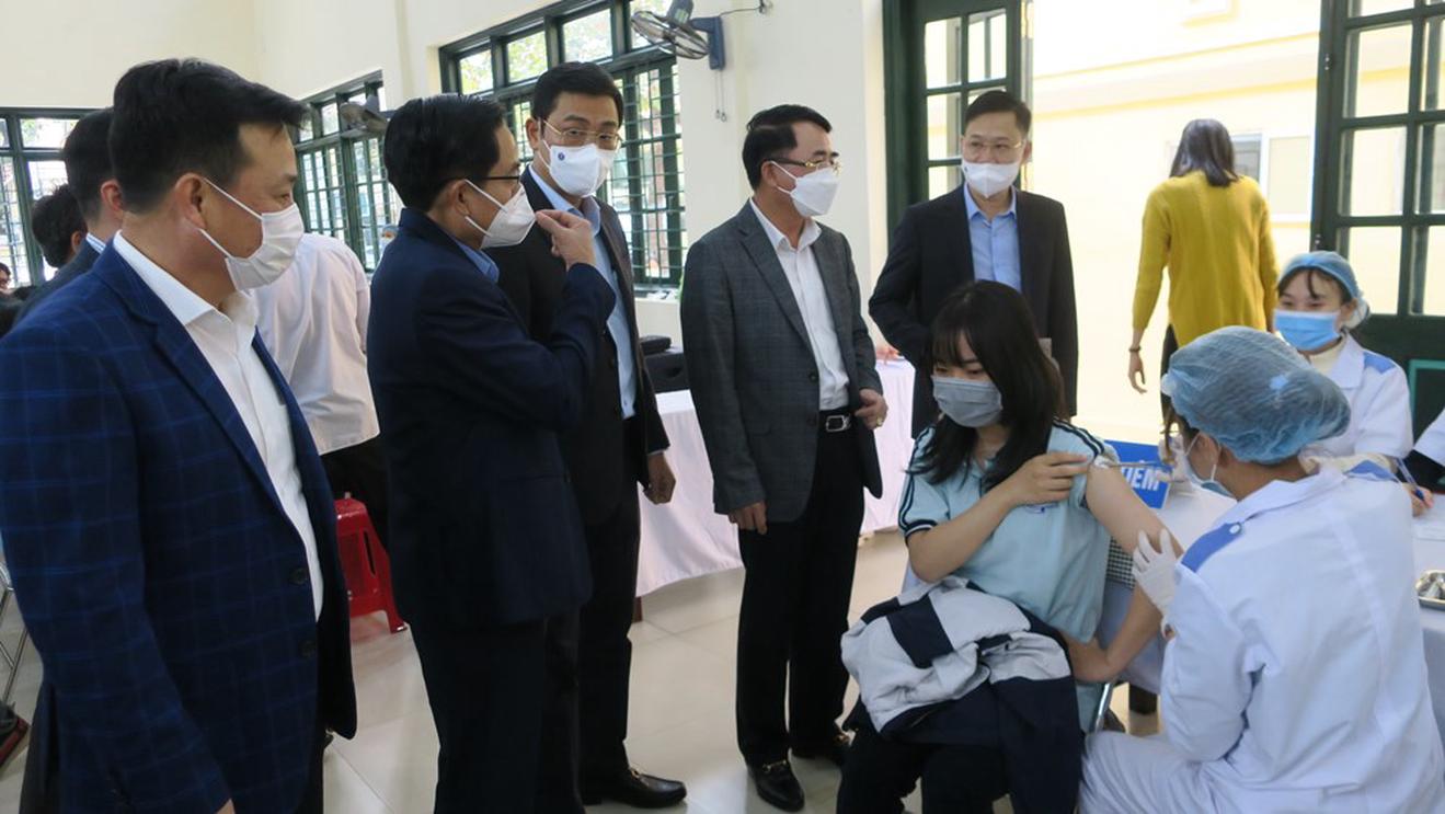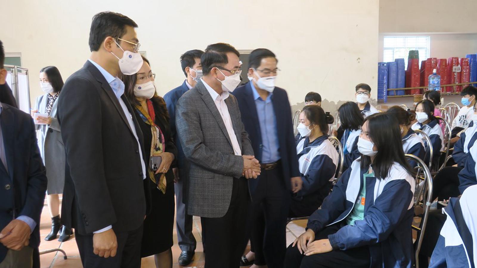 Phó Chủ tịch UBND thành phố thăm hỏi sức khỏe các cháu vừa thực hiện tiêm vắc xin tại Trường THPT Mạc Đĩnh Chi. Ảnh: HT