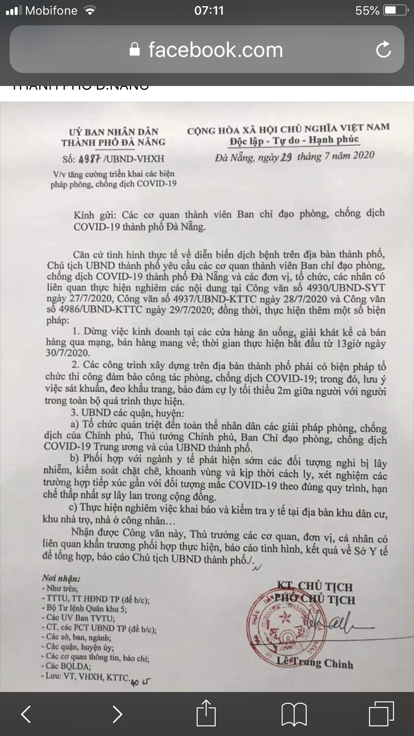 UBND TP Đà Nẵng ra văn bản dừng kinh doanh ăn uống, giải khát, bán hàng qua mạng, mang về. Ảnh: NP