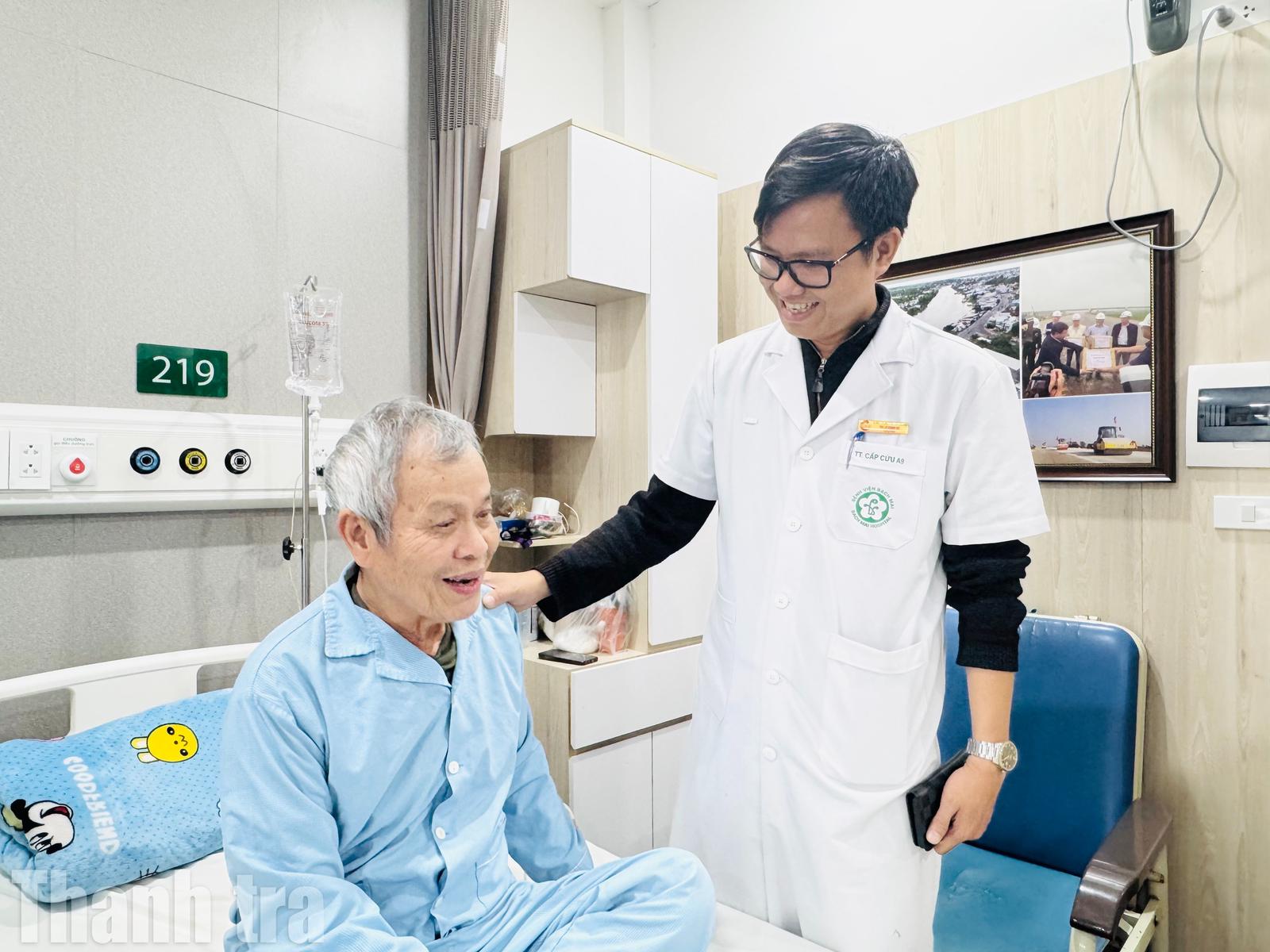 Ths Lê Quang Trí, Điều dưỡng trưởng Trung tâm Cấp cứu A9, Bệnh viện Bạch Mai động viên bệnh nhân. Ảnh: Thanh Lương