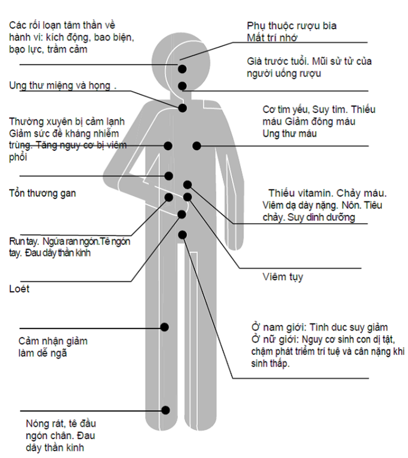 Thứ hai, chất cồn gây nhiễm độc cấp tính, tác động lên cấu trúc và dẫn truyền của thần kinh trung ương, làm rối loạn phối hợp động tác, giảm tỉnh táo, rối loạn nhận biết, ảnh hưởng đến hành vi, từ đó gây ra các hậu quả cho người uống và người xung quanh (thương tích, tai nạn giao thông, bạo lực, hành vi nguy cơ...). Thứ ba, chất cồn là chất hướng thần gây lệ thuộc làm cho người uống phải gia tăng liều dùng và tái sử dụng. Việc uống rượu, bia thường xuyên dẫn đến thích nghi thần kinh khiến cho việc giảm liều lượng hoặc ngừng uống sẽ dẫn đến hội chứng “cai rượu”. Lệ thuộc rượu, bia sẽ gây ra loạn thần do rượu và dẫn đến mắc các bệnh mạn tính cũng như gây ra các hậu quả trước mắt và gánh nặng lâu dài cho xã hội.