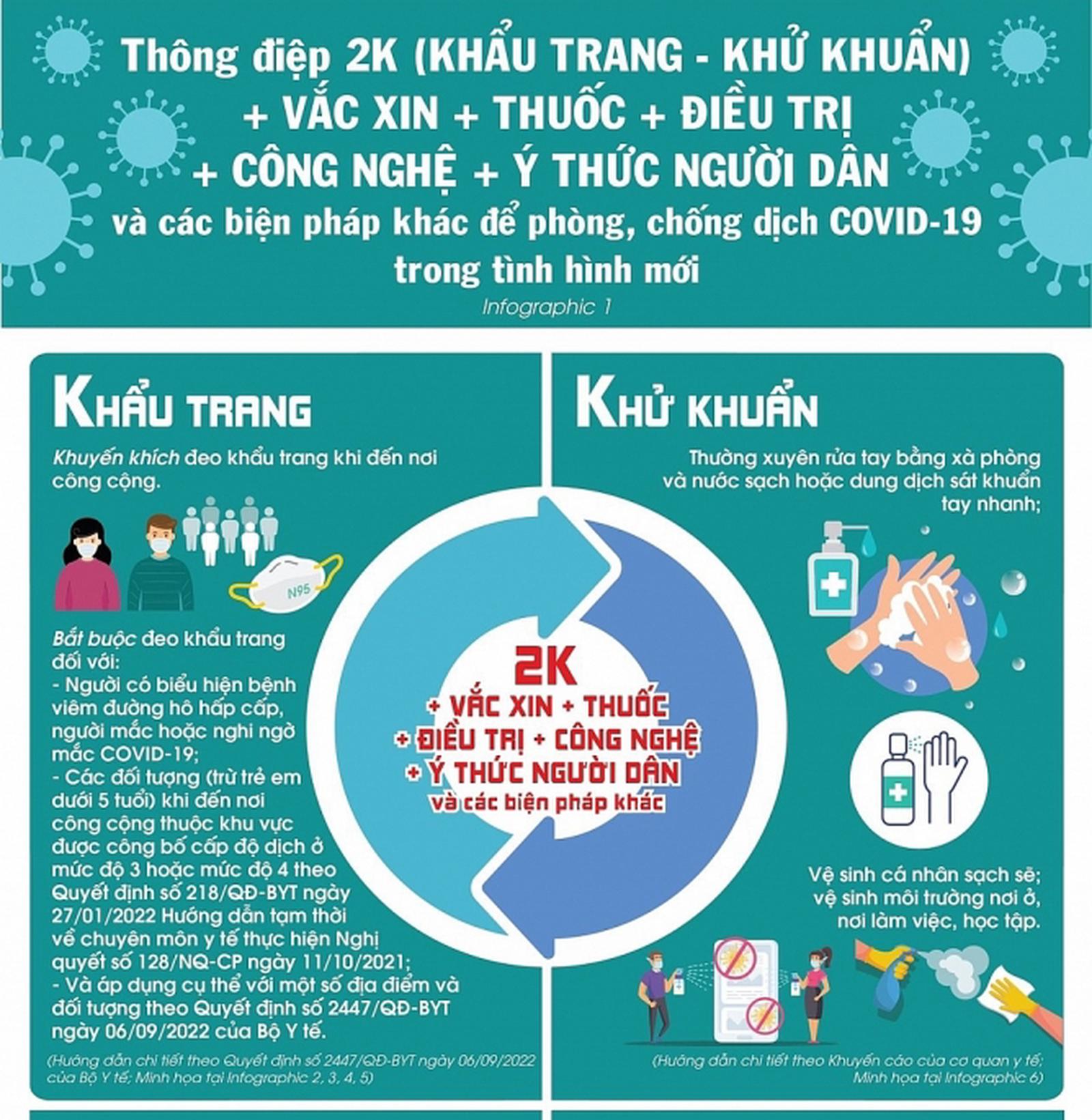 Trong thông điệp phòng, chống dịch COVID-19 mới nhất của Bộ Y tế, thông điệp 5K giảm còn 2K gồm khẩu trang, khử khuẩn. Cùng với đó, Bộ Y tế cũng kêu gọi người dân tiêm vaccine COVID-19 đầy đủ và đúng lịch, kết hợp "thuốc + điều trị + công nghệ + ý thức người dân" và các biện pháp khác.