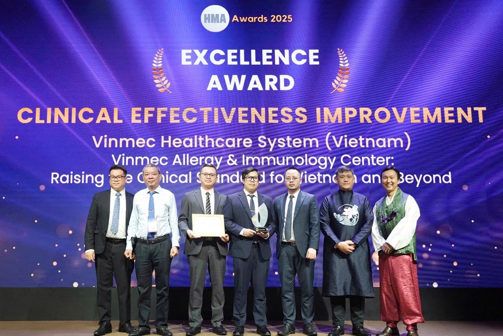 (Thanh tra) - Trung tâm Dị ứng - Miễn dịch lâm sàng thuộc Hệ thống Y tế Vinmec vừa giành giải thưởng “Nâng cao hiệu quả điều trị lâm sàng” (Clinical Effectiveness Improvement) tại Hội nghị Quản lý Bệnh viện châu Á 2025 (Hospital Management Asia – HMA 2025). Đây là lần đầu tiên một cơ sở y tế Việt Nam nhận được giải thưởng danh giá này, khẳng định bước tiến mới của Vinmec và mở ra cột mốc mới cho ngành Y tế Việt Nam.