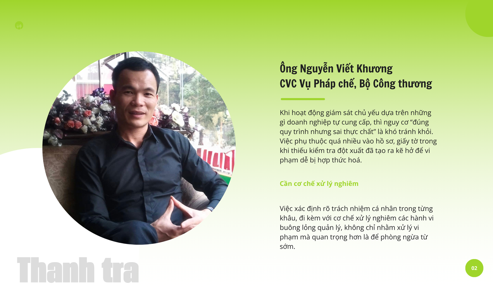 “Việc phụ thuộc quá nhiều vào hồ sơ, giấy tờ trong khi thiếu kiểm tra đột xuất đã tạo ra kẽ hở để vi phạm dễ bị hợp thức hóa”, ông Khương nhận định.