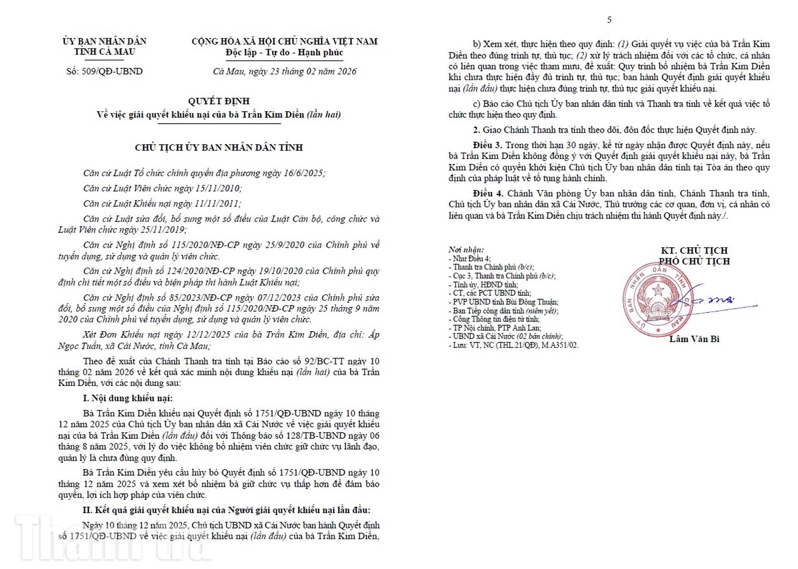 Theo đó, tại Quyết định số 509/QĐ-UBND ngày 23/2/2026 của Chủ tịch UBND tỉnh Cà Mau về việc giải quyết khiếu nại lần hai của bà Trần Kim Diền, cho thấy sự việc bắt nguồn từ việc bà Diền khiếu nại Quyết định số 1751/QĐ-UBND ngày 10/12/2025 của Chủ tịch UBND xã Cái Nước.