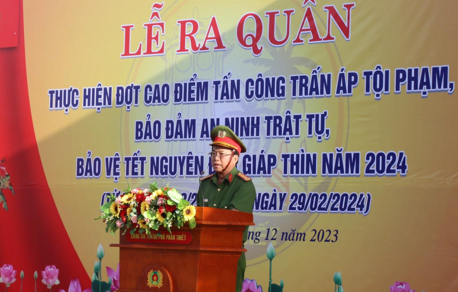 Đại tá Đinh Kim Lập, Phó Giám đốc Công an tỉnh phát biểu chỉ đạo tại Lễ ra quân năm 2023. Ảnh: Như Ý
