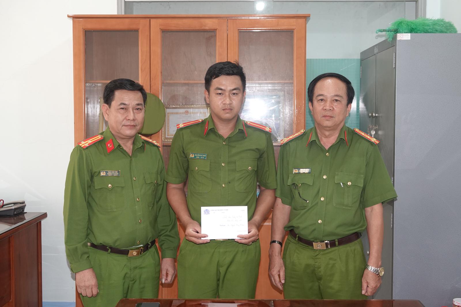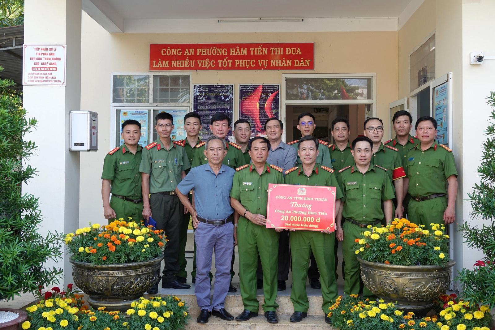 Đại tá Đinh Kim Lập thưởng nóng cho Công an phường Hàm Tiến trong phối hợp khám phá thành công chuyên án giết người. Ảnh: Như Ý